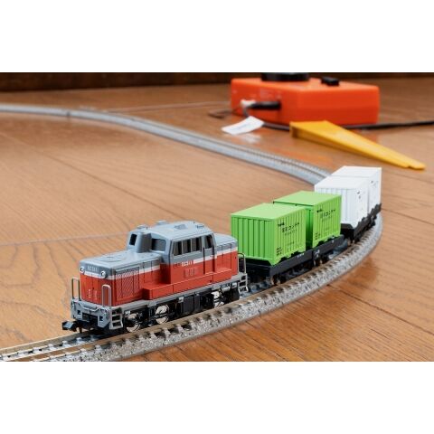 小型ディーゼル機関車と貨車の入ったセット TOMIXをはじめるのに必要なレール、パワーユニット、車両などが全てセットになってお求めやすい価格になりました 別売のレールを使ってレイアウトをひろげられるほか、発売中のDF200ファーストセットと組み合わせて複線運転ができます 小型ディーゼル機関車はDD51-1号機を模したデザイン 貨車はグリーンの国鉄コンテナと白の冷蔵コンテナを載せたコム1をセット 制御機器はコンパクトなPU-FG-17をオリジナルカラーのオレンジにしてセット
