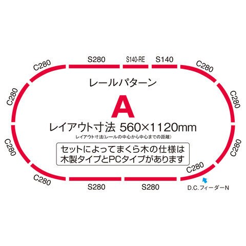 扱いやすいファイントラックでPC枕木を再現したレールを採用 レール配置は最も基本的なレールパターンA(小判型) レイアウト寸法:560×1120 (レールの中心と中心までの距離)