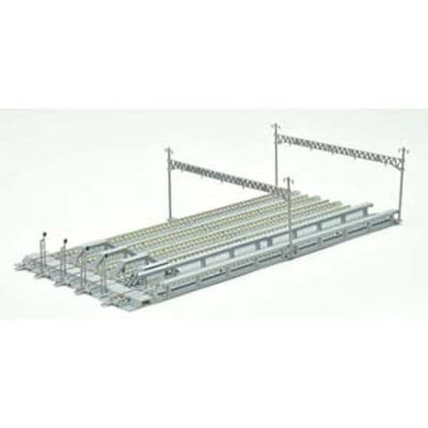 5線ある留置線の内4線は線路間隔が今までのトミックスの複線間隔より狭くなっています レール同士は簡単確実な接続 構内踏切レールを新規製作 車両基地の昇降台や信号機、洗車作業台などのパーツが付属 マルチ複線トラス架線柱が付属