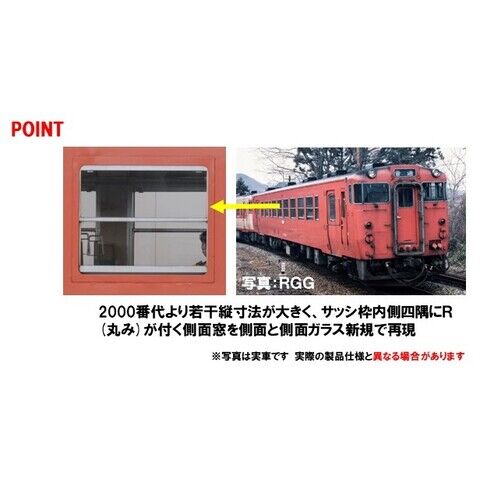 2000番代より若干縦寸法が大きく、枠の内側四隅にR(丸み)がつくユニットサッシ窓をもつ車体を新規で再現 縦の雨どいが車体内部に収まった554番以降の後期型で再現 台車はDT44A・TR227Aを装着 床下は、DMF15エンジンやさまざまな機器などディーゼルカー特有の複雑な形態を再現 前面のジャンパ栓はホースまたは栓蓋を選択取付可能 前面表示部は交換式で印刷済みパーツ「普通(紺地)・快速」を付属 側面表示灯はクリアパーツ取付済み 一部表記類は印刷済み 車番は選択式で転写シート付属 ヘッド・テールライト、前面表示部はON-OFFスイッチ付き ヘッドライトは電球色LED、テールライトは赤色LED、前面表示部は白色LEDによる点灯 後方時や連結面間の運転室内が点灯する運転室室内灯装備 運転室室内灯はスイッチの切替により、運転室が中間に入った時のヘッド・テールライト、前面表示部消灯状態でも点灯可能 密自連TNカプラー標準装備 最小半径R490通過可能(※S字形の線形は除く) 登場時の朱色5号1色の首都圏色で再現 窓の各Hゴムはグレーで再現、JRマークは選択式で転写シート収録 フライホイール付きモーター搭載の動力車