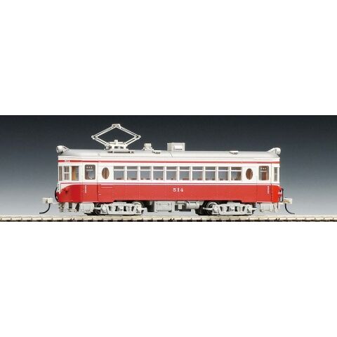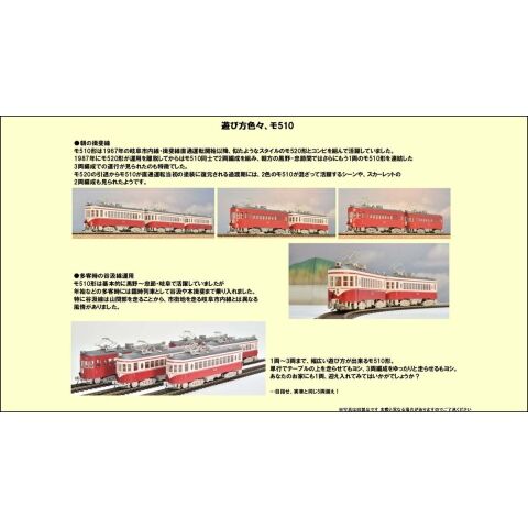名鉄モ510形は名鉄岐阜市内線で活躍した小型ボギー車で1926年に名鉄の前身の1つである美濃電気軌道により製造されました 1960年頃までは美濃町線で活躍しましたが揖斐線と岐阜市内線の直通運行開始時に各種機器の変更やクロスシート化を行い、合わせてスカーレットと赤のツートンカラーに変更されました その後一部塗装の省略やスカーレット単色化を経て、1988年には再び直通開始当初の塗装に戻され、モ513・514の2両は2005年の名鉄600V区間廃止まで活躍しました 現在でもモ512~515が岐阜県内を中心に保存されています