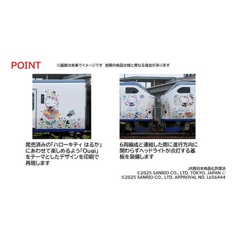 3両編成の「ハローキティ はるか」ラッピングを再現 本製品と<98674><98690><98692>ハローキティはるか各セットを連結して9両編成が再現可能 屋根上にあるJRマークは印刷済み 車番はHA632編成を印刷済み シートパーツはカラーシートで再現 側面ガラスはスモークガラスを再現 ヘッド・テールライトは常点灯基板装備、ON-OFFスイッチ付 ヘッドライトは電球色LEDによる点灯 先頭車同士の連結時用として進行方向に関わらず点灯するヘッドライト点灯機能装備 先頭車運転台側のみTNカプラー(SP)装備 新集電システム、銀色車輪採用