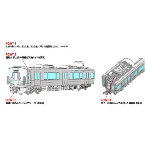 225系Aシート、521系、323系に準じた前面形状のリニューアル 車両のプロトタイプは後期型の姿を再現 新集電システム、銀色車輪採用 前面表示部は交換式で印刷済みパーツ装着済み、交換用パーツ付属 先頭車の転落防止幌は別パーツとし、先頭時用と連結時用の2種を付属 「Red Wing」ロゴ、JRマーク印刷済み ヘッド・テールライトは白色LED、フォグライトはカラープリズムにて黄色の点灯を再現 ヘッド・テールライト、前面表示部は常点灯基板装備、ON-OFFスイッチ付 先頭車運転台側はTNカプラー(SP)装備 車番は選択式で転写シート付属 フライホイール付動力、新集電システム、銀色車輪採用 M-13モーター採用