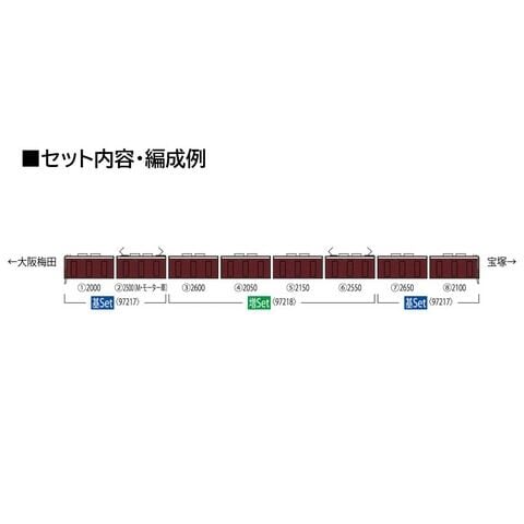 トミックス初の阪急電鉄車両新2000系を製品化 <97217>と<97218(別売り)>を組み合わせることにより8両編成が再現可能 社紋、宝塚線第1編成の車番は印刷済み 前面表示は印刷済みパーツ「急行 大阪梅田」装着済み 前面表示は交換用パーツ対応(増結セットに付属のものを使用) ヘッド・テールライト・列車種別識別灯は常点灯基板装備、白色LEDで点灯 列車種別識別灯は切替式で2灯、1灯、無点灯を選択可能 先頭車運転台側はダミーカプラー装備 フライホイール付動力、新集電システム、銀色車輪採用 M-13モーター採用 吊り下げ形状の紙製パッケージを採用