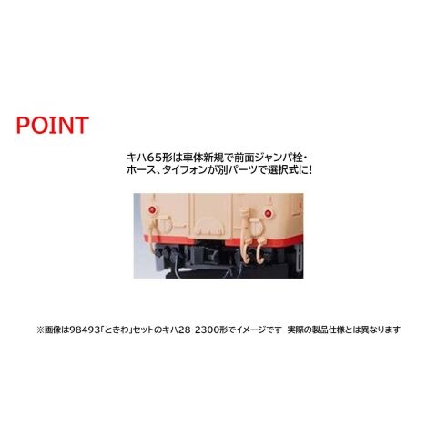 ハイグレード(HG)仕様 キハ65形の車体、側面窓は新規金型により、キハ58・28形と同様に前頭部のジャンパ栓・ホース、タイフォン別パーツ化で細密感が向上 普通車のシートはリクライニングシート形態採用 ヘッド・テールライトの遮光ユニットはキハ56-200形で採用した小型の遮光ケースにより、前頭部周りのシースルー感が向上 印刷済みトレインマーク付属 キロハ28形のグリーンカーマークとロゴは印刷で再現 ヘッド・テールライト、前面表示部は常点灯基板装備、ON-OFFスイッチ付 ヘッド・テールライト、前面表示部は白色LEDによる点灯 ヘッドライトはカラープリズム採用により電球色に近い色で点灯 前面表示部は交換式で印刷済みパーツ「急行」とベースが黒色の「急行」を付属 車番は選択式で転写シート付属 フライホイール付動力、新集電システム、黒色車輪採用 M-13モーター採用、TNカプラー(SP)標準装備