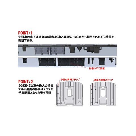 山手線や埼京線で一般的に見られた小型のATC機器を新規制作で再現 中間車の妻面は千鳥配置になったステップを再現 5号車に組み込まれるモハ204形トレーラー車はMGなどの機器がない床下を再現 5号車用に国鉄時代の編成を再現するためのMG付き床下機器を付属 スカート無しダミーカプラー付属 ヘッド・テールライト、前面表示部は電球色LEDによる点灯 車番は選択式の転写シート対応で基本セットのみに付属 フライホイール付動力、新集電システム、黒色車輪採用 M-13モーター採用