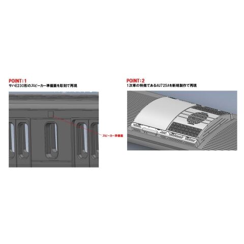 AU725A型クーラーを搭載した1次車を新規製作で再現 スカートは登場当初の姿を再現 台車は新製当初のライトグレーを再現 サハE230形は新たにスピーカー準備蓋を彫刻で再現 前面表示部は交換式で印刷済みパーツ装着済み、交換用パーツ付属 前面・側面グリーンガラスを再現 強化型スカート付属 ヘッド・テールライト、前面表示部は白色LEDで点灯 車番は選択式で転写シート付属 JRマークは印刷済み フライホイール付動力採用 新集電システム、黒色車輪採用 M-13モーター採用