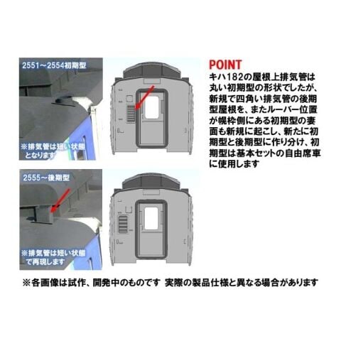• キハ182形は屋根と妻面それぞれに新規の金型を起こし組合わせることで、排気管形態が異なる初期型と後期型(2555番以降)を新たに区分して再現、初期型は基本セットの自由席設定車に使用