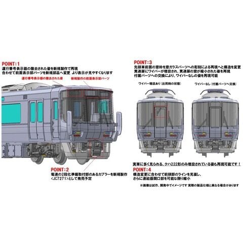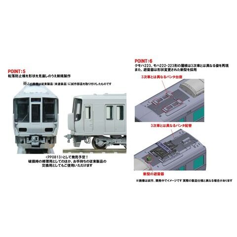 先頭車前面の窓枠を窓ガラスパーツへの彫刻による再現へと構造を変更 貫通扉にワイパーが増設され、貫通扉の窓が縮小された姿を再現、交換用の貫通扉にワイパーのない前面窓パーツが付属 転落防止幌は形状を見直し新規製作、従来製品にも取り付け可能で分売パーツ(PP0813)として発売予定 電連の2段化準備取付部のあるカプラーを新規製作 運行番号表示部の撤去された姿を新規製作で再現 避雷器は形状変更された新型を採用 クモハ223、モハ222、モハ223形の屋根は3次車とは異なる姿を再現 前面窓は交換の進む現在の姿をイメージしグリーン、側面窓は1次車由来のスモークで再現 先頭車同士の連結時用として進行方向に関わらず点灯するヘッドライト点灯機能装備 先頭車のスカートは下部が延長された姿を再現 JRマークは印刷済み 前面表示は印刷済みパーツ「A新快速 姫路」装着済み、交換用パーツ付属 車番は選択式で転写シート付属 ヘッド・テールライト、前面表示部は常点灯基板装備、ONーOFFスイッチ付、白色LEDによる点灯 先頭車運転台側は胴受の小さいTNカプラー(SP)装備 フライホイール付動力、新集電システム、銀色車輪採用 M-13モーター採用 金型の関係上一部実車と異なります