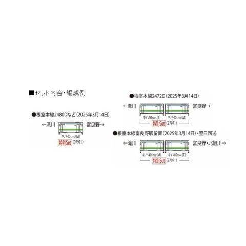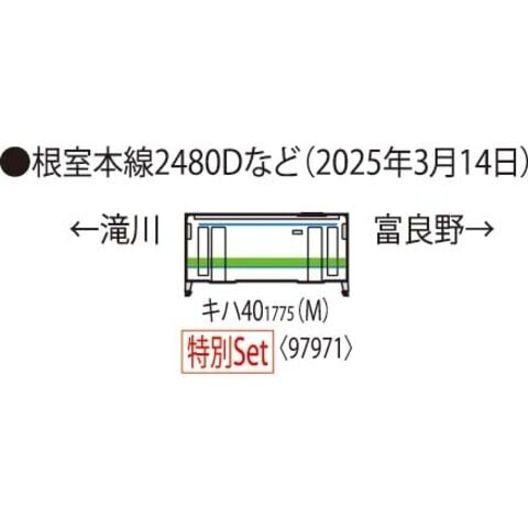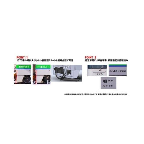 ハイグレード(HG)製品 2025年ダイヤ改正で、根室本線滝川~富良野間での運用を終えたキハ40-1700形の最終日3月14日に運用された、1722番・1744番・1745番・1775番全車4両を再現してメモリアルセットとして発売 メモリアルとして、キハ40形の根室線での活躍などを紹介する小冊子付属と、ブック型プラケースを被せ箱に入れたパッケージスタイルを採用 側面と前面にある車番と所属表記、ATS表記は印刷済み 靴摺り、ドアレールは銀色で印刷 1722番と1775番は元釧路所属車より、2エンド側貫通扉にある標挿しの枠を銀色で印刷再現 1722番と1775番に動力搭載、1744番と1745番はトレーラー仕様 元キハ40-100形後期型の1775番には、新規製作で後期型特徴の傾斜角が少ないスカートを装着 ジャンパホースは付属パーツ取付により立体的に再現可能 交換式の印刷済み前面表示の「ワンマン」は1744番の2エンドのみ字体が微妙に異なる2種を付属、また最終日以外も再現できる快速が赤文字の「快速ワンマン」と全て緑文字の「快速ワンマン」を各2個、また回送を兼ねたツアー時の「臨時」を2個付属 ヘッド・テールライト、前面表示部は常点灯基板装備、ON-OFFスイッチ付、白色LEDによる点灯 ヘッドライトはカラープリズムの採用により電球色に近い色で点灯 フライホイール付動力、新集電システム、黒色車輪、M-13モーター採用 1775番の傾斜角が少ない後期型スカートを新規金型で再現