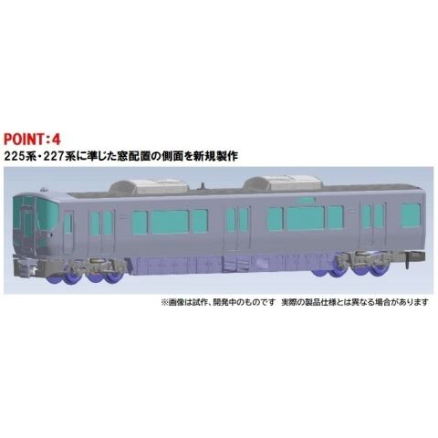 新集電システム、銀色車輪採用 前面表示部は交換式で印刷済みパーツ装着済み、交換用パーツ付属 先頭車の転落防止幌は別パーツとし、先頭時用と連結時用の2種を付属 JRマークは印刷済み ヘッド・テールライトは白色LED、フォグライトはカラープリズムにて橙色の点灯を再現 ヘッド・テールライトON-OFFスイッチ付 先頭車運転台側は胴受けの小さいTNカプラー(SP)を採用 車番・スカートの編成番号は選択式で転写シート対応(基本セット付属) 銀色車輪採用