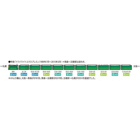 後年の黄色帯にフチが付いた姿を銀色で製品化、カニ24を除く客車はエンブレムマーク印刷済み スシ24のテーブルランプ点灯式 オハネフ25とオハネ25-560は2段ベッドシート採用 スロネフ25・カニ24のテールライト・トレインマーク白色LEDによる点灯、常点灯基板装備 スロネフ25・カニ24のトレインマーク印刷済み、スロネフ25はダミーカプラー装着済み 車番は基本セットAの客車のみ印刷済み、増結セットA・基本セットBは選択式で転写シート付属 新集電システム・黒色車輪採用(EF81形除く)