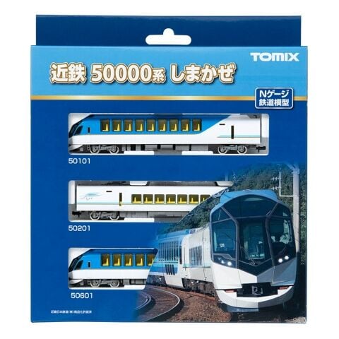 多角面が採用された先頭形状を再現 パンタグラフは上昇姿勢を見直したパーツを採用 ク50100とク50600はシート配置が異なる姿を再現 モ50200とモ50500はシート配置が異なる姿を再現 第1編成の車番印刷済み 「しまかぜ」ロゴマークは印刷済み ヘッド・テールライトは常点灯基板装備 ヘッドライトは白色LED、テールライトは赤色LEDによる点灯 窓周りの黒フチを再現 側面ガラスはグリーンガラスを再現 先頭部はダミーカプラー装着済み ひのとりと同じパーツを採用 フライホイール付動力、新集電システム、銀色車輪採用 M-13モーター採用