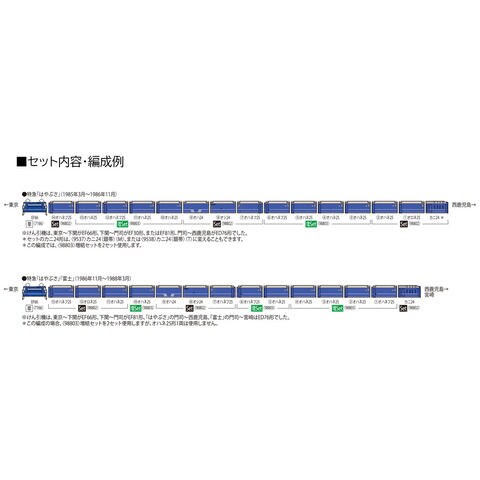 オハ24-700形の連結が開始された1985年頃の寝台特急「はやぶさ」を再現 (98802)セット1個と(98803)増結セットを2個使用でフル編成を再現可能 オハ24-700形はオシ14形改造の701・702番を再現 オハネフ25-100・200、オハネ25-100、オロネ25-0形は非常口が原型の国鉄時代の姿を再現 カニ24-0形はマイクロスカートのある前期型を再現 オハネフ25-100形はTNカプラーを新規製作、装着済み オハネフ25-200形はライト基板・トレインマーク印刷無し オシ24形はオシ14形から編入された100番代で銀帯となった姿を再現 テールライト、トレインマークは常点灯基板装備、オハネフ25-100形はON-OFFスイッチ付 テールライト、トレインマークは白色LEDによる点灯 ベッドは青色で再現 Hゴムはグレーで再現 機関車用ヘッドマークはお椀型「はやぶさ・あさかぜ・富士」、山型「富士」付属 トレインマークは「はやぶさ」印刷済みガラスパーツを装着済み、交換用に印刷無しのガラスパーツとシール付属 JRマーク、車番は選択式で転写シート付属 新集電システム、黒色車輪採用 2025年7月生産分より使用する台車が<0098>TR217台車へと変更になります(カニ24除く)