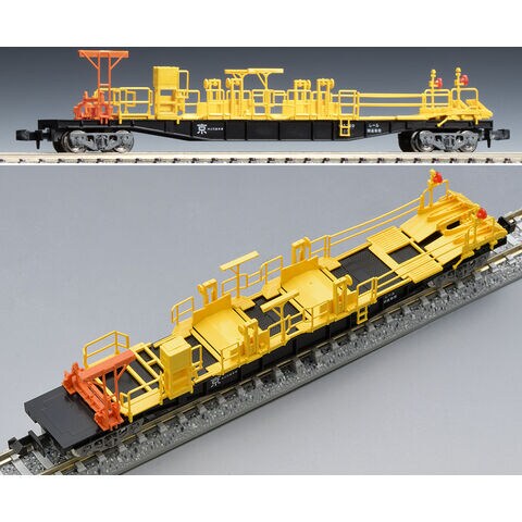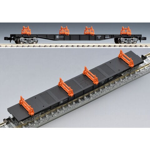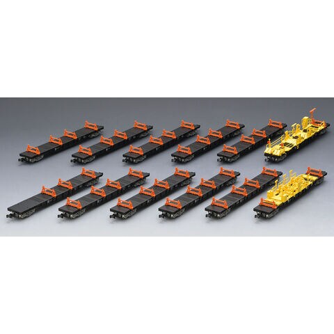 JR西日本が所有するロングレール輸送用のチキ5500形を新規製作で再現 側面リブが多い車両を再現 編成中央部に入るチキ5600形の緊締装置と最後尾のチキ5700形のエプロン装置は黄色で再現、その他の緊締装置はオレンジ色で再現 車番・標記類は印刷済み 反射板パーツ付属 グレー台車枠、銀色車輪採用