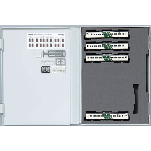ハイグレード(HG)仕様 JRマーク、靴摺り、ドアレールは印刷済み トイレタンクは取付済み ヘッド・テールライト、トレインマークは常点灯基板装備、ON-OFFスイッチ付 ヘッド・テールライト、トレインマークは白色LEDによる点灯 ヘッドライトはカラープリズムの採用により電球色に近い色で点灯 フライホイール付動力、新集電システム、黒色車輪採用 M-13モーター採用 先頭車運転台側は胴受の小さいTNカプラー(SP)を採用 各連結面間には配管付きTNカプラー(SP)標準装備 トレインマークは「臨時快速」装着済み、「修学旅行」「団体」付属 車番は印刷済み