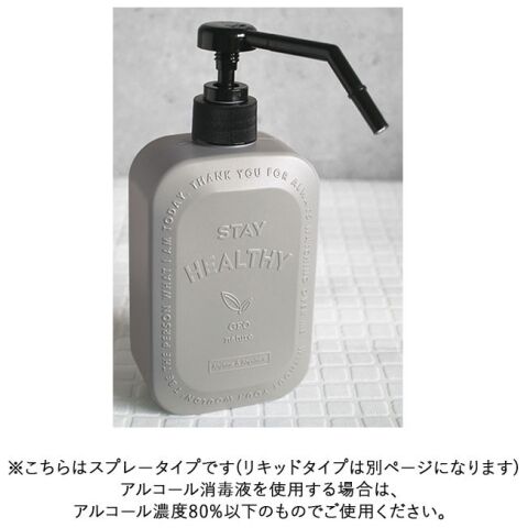 - 注意書き:アルコール濃度80%以下でご使用ください。本品はアルコール消毒液用のディスペンサーです。火気には絶対に近づけないでください。引火する可能性があります。暖房器具など温度が高くなるものの近くには置かないでくださいたわし、磨き粉等で磨くと傷が付く事があります。ジェルタイプの消毒液や粘度の高い液体は使用できません。内容物となる液体の一部の成分と反応し本体、スプレーポンプ、液体が変色することがあります。内容物となる液体の注意表記に従いご使用ください。専用容器の指定がある場合はその指示に従ってください。高い所から落としたり、強い衝撃による破損にご注意ください。中身を入れたまま長期間放置すると内容物の変化や本体への着色、変色が起こる場合があります。スプレーの目詰まり防止のため、定期的にスプレーポンプ自体の洗浄を行ってください。目詰まりした時は該当部分をぬるま湯に入れ、詰まっている液体をポンピングしながら溶かしてください。本来の目的以外では使用しないでください。持ち運びの際は下部をお持ちください。容器内に液体が入っているときは本体を傾けたり、逆さまにしたりしないでください。中の液体が漏れる恐れがあります。本体をシンナー・ベンジン等で拭かないでください。別の液体に詰め替える際は、容器内をよく洗い乾燥させてからお使いください。アルコールが広範囲に飛散することがあります。アルコールの影響を受けやすいものは近くに置かないでください。カメラやモニターの性質により、画像と実物の色の違いがある場合がございますのでご理解願います。