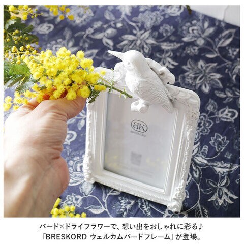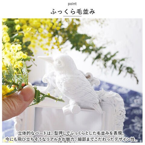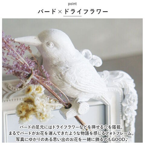 バードの足元にはドライフラワーなどを挿せる穴を搭載。まるでバードがお花を運んできたような物語を感じるフォトフレーム。写真にゆかりのある思い出のお花を一緒に飾るのもGOOD♪