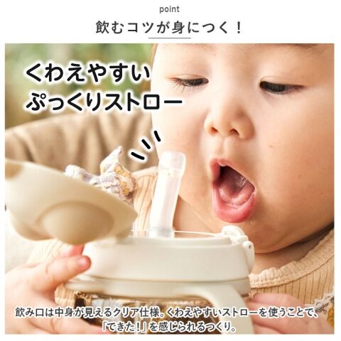中身が見えやすい飲み口とくわえやすいストローで飲む感覚を覚えられます。はじめてでも「できた! 」が感じられる設計です。