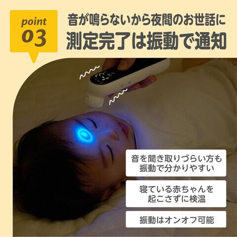 測定完了は振動で通知するので、寝ている赤ちゃんを起こさずに検温できます。