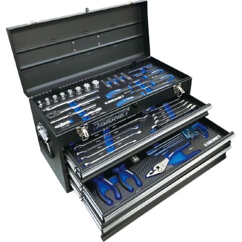 - セット内容/付属品:3/8DR六角ソケット(8・10・12・13・14・17・19・22mm)、3/8DR六角ディープソケット(8・10・12・14mm)、3/8DRエキステンションバー(75・150mm)、3/8DRユニバーサルジョイント、3/8DRスピンナ―ハンドル(200mm)、3/8DRT型スライドハンドル(150mm)、3/8DRラチェットハンドル(72ギア)、45°メガネレンチ(コンパクトサイズ)(8×10・11×13・12×14・17×19・22×24mm)、SIGNETレンチ(10・12・13・14・17mm)、ミニドライバー((+)#0×75・(-)2.5×75)、ソフトグリップドライバー((-)6×100・(-)8×150・(+)1×75・(+)2×100mm)、ボールピンハンマー(12オンス)、9PCロングボールヘックスレンチセット、スリップジョイントプライヤー(200mm)、強力ラジオペンチコンフォートタイプ(160mm)、強力ニッパーコンフォートタイプ(160mm)、1/4DRコンパクトツールセット(22041 ロールチョイス 37PC 1/4SQソケット&ビットセット)、ツールボックス、マットブラック、ツールボックスカバー