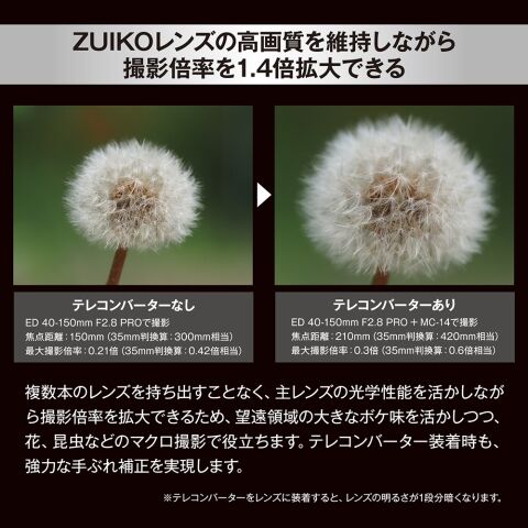 ◆ZUIKOブランドの名を冠したMC-14は、装着するレンズの焦点距離を1.4倍に変えます。
