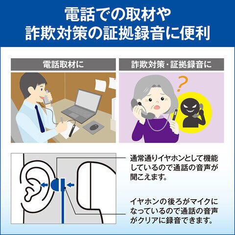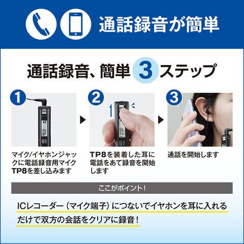 ◆TP8をICレコーダーのマイク端子につなぎ、イヤホンを耳に入れるだけで、電話での会話を明瞭に録れます