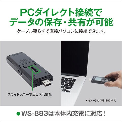 また、スライドレバー式のUSB端子を備えており、ケーブルやソフトウェアなしで録音データの転送が簡単におこなえます。