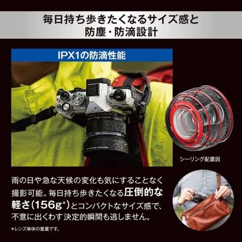 - 防滴性能 / 防塵機構:‌保護等級1級(IPX1):OM SYSTEM社の防滴ボディと組み合わせたときに性能を発揮します。/ 防塵機構