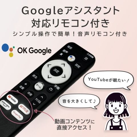 リモコンに向かって話すだけで、コンテンツの検索、音量の調整などを簡単操作! You Tube、Amazonプライムビデオ、NETFLIX、Google Playの4つの動画配信サイトのダイレクト選定機能を搭載。