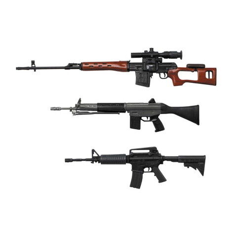 1989年に自衛隊で制式化され、海上保安庁、警察の特殊部隊(SAT)において制式採用の国産アサルトライフル『89式小銃』、ソビエト連邦が開発した名狙撃銃『SVD&PSO-1』、米軍の各部隊に多数配備された『M4A1』の3種をモデル化。