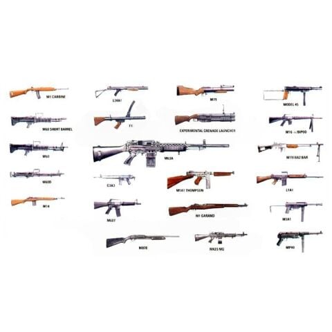 セットにはM1カービン、M1918A2BAR、M1ガーランド、M1A1トンプソンなどのお馴染みの火器類からM14、M3A1、M4A1、M79、エクスペリメンタル・グレネードランチャー、L34A1サブマシンガン、M60機関銃、M60ショートバレル、M60D、L1A1セルフローディングライフル、G3A3、M63A、MK23、MP40など、幅広いラインナップを収録。