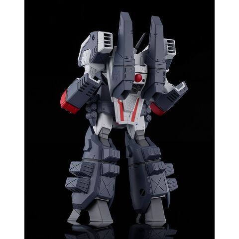バトロイドバルキリーにウエポンコンテナや増槽など装着した状態を、変形やアーマード装備脱着機構をあえて廃することで設定画やアニメ登場時に見られる力強くまとまり感がある姿で立体化しました。