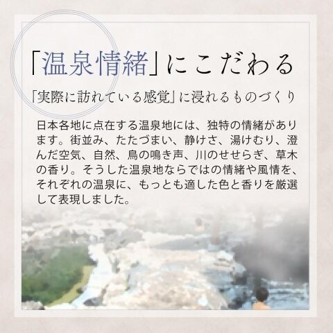 ※各温泉地で温泉に関わった活動をしている自治体または団体にコンセプト、湯ざわり、色、香り等を品質確認いただき発売しています。