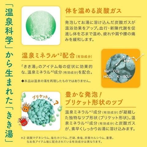 ◆ツブに凝縮された温泉ミネラルと炭酸ガスの発泡効果が、あなたのその疲れを素早く、そしてじっくりケアする『きき湯』。