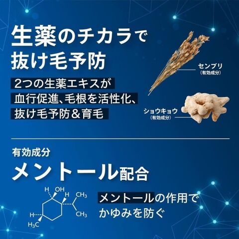 ■成分: ショウキョウエキス、センブリエキス、メントール、DME、無水エタノール、スペアミント油、メンチルグリセリルエーテル、ニンジンエキス、牡丹エキス、エタノール、BG