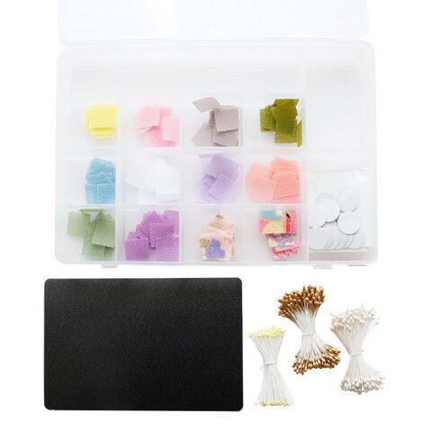 ◆つまみ細工用にカットされた一越ちりめんが12色各15枚、台紙に使える専用厚紙、花芯に使えるペップが入ったお得なセットです。
