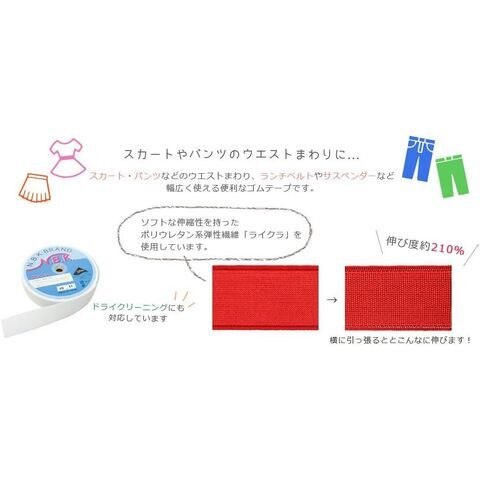 ◆スカートやパンツなどのウエストまわり、ランチベルトやサスペンダーなど幅広く使える便利なゴムテープです。