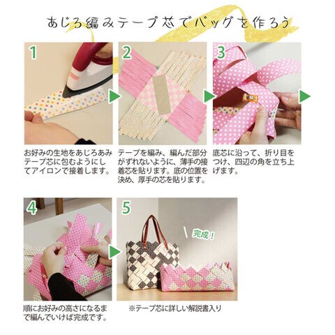 ◆お好みの生地をテープ芯にアイロンで貼り付けて編みこんでいくとバッグや小物入れが作れます。