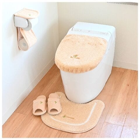 ◆ころんとした丸みのあるフォルムが特徴的なトイレマットは、ワンポイントのロゴマーク付きで可愛らしさも感じる仕上がりになっています。