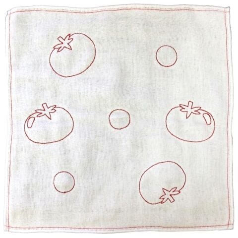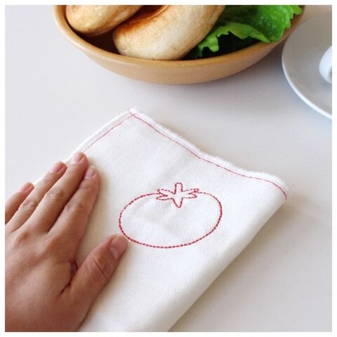 ◆真っ白なふきんにトマトの刺繍がアクセント。
