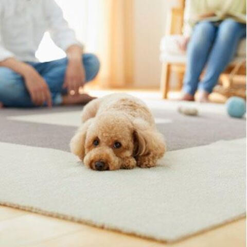 ◆ツルッとすべって足腰に負担がかかってしまうフローリングを草原を思いっきり走り回っているようなふかふかラグへ変えてくれるペットラグ「ピタペトモ」。