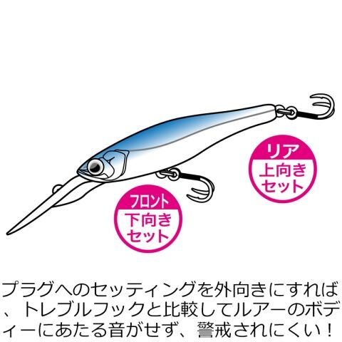プラグへのセッティングを外向きにすれば、トレブルフックと比較してルアーのボディーにあたる音がせず、警戒されにくい!