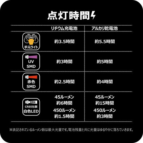 ・白色LED(最大450ルーメン時):1.5時間