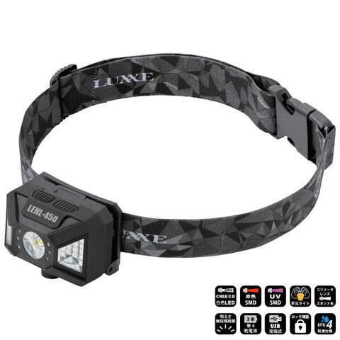 ラグゼ 充電式LEDヘッドライト 450ルーメン LUXXE LEDライト LEHL450 【返品種別A】