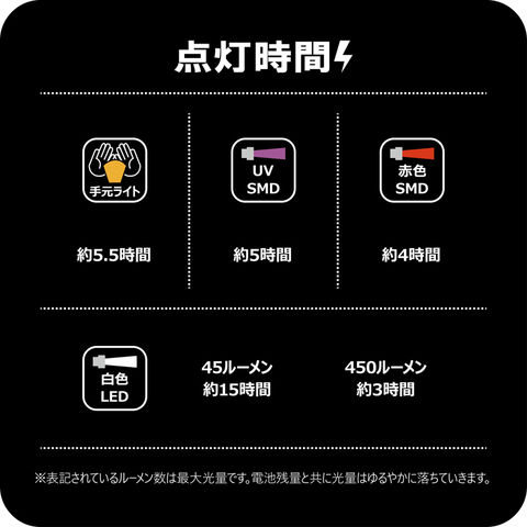 - 明るさ(約):45~450ルーメン(無段階調光)