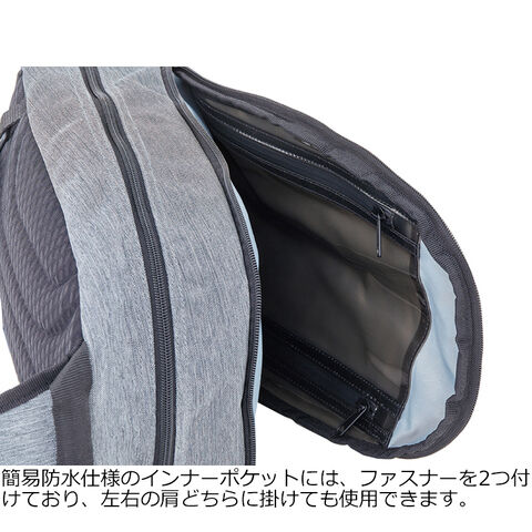 ◆簡易防水仕様のインナーポケットには、ファスナーを2つ付けており、左右の肩どちらに掛けても使用できます。
