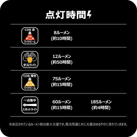 ・白色LED(185ルーメン時):4時間 - 本体サイズ(約):幅60×奥行32×高さ46mm