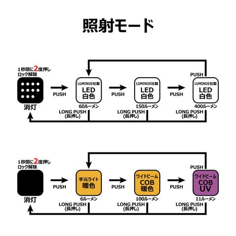 ◆点灯は1秒間に2度押し・消灯は長押し。