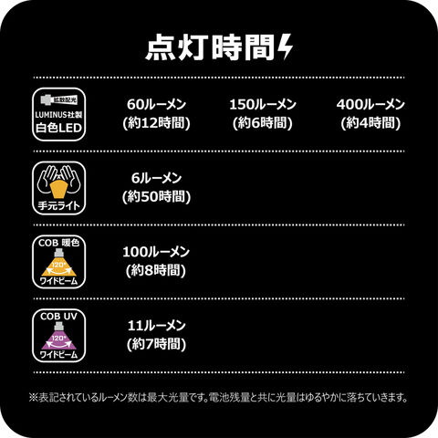 ・COB UV ワイドビーム120度 - 使用電池:リチウムポリマー充電池1500mAh